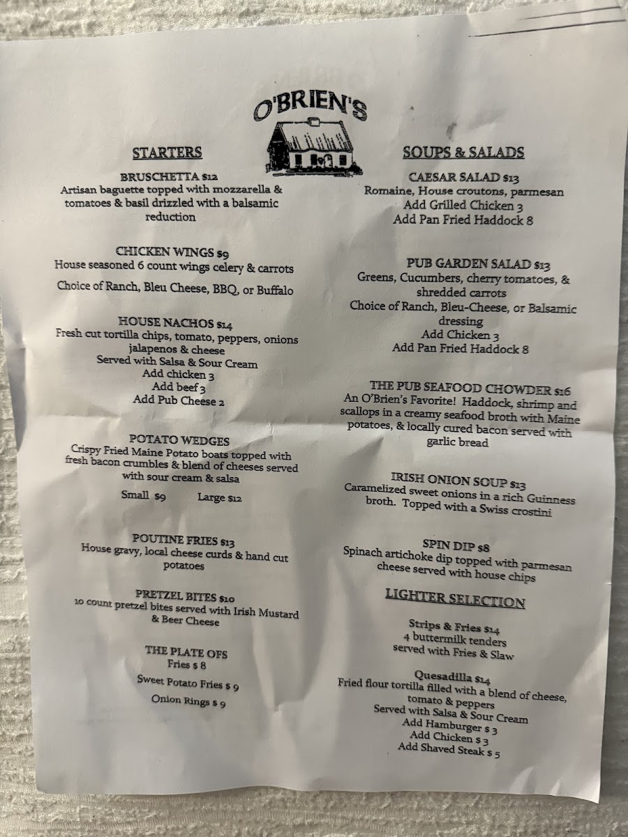 O'brien's Irish Restaurant & Pub Menu